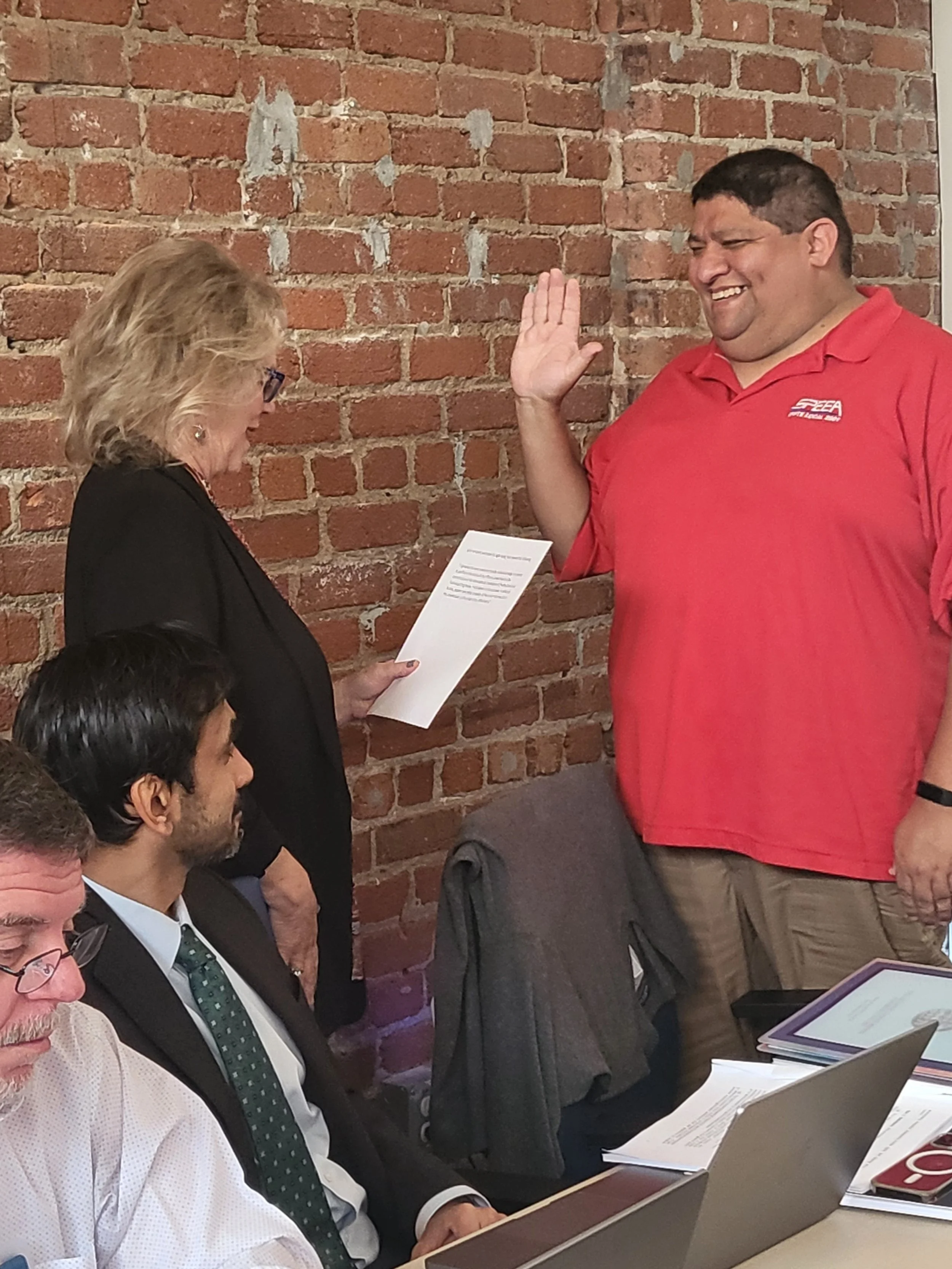 IFPTE Secretary-Treasurer Gay Henson swearing in John Dimas, IFPTE Vice President from SPEEA/IFPTE Local 2001