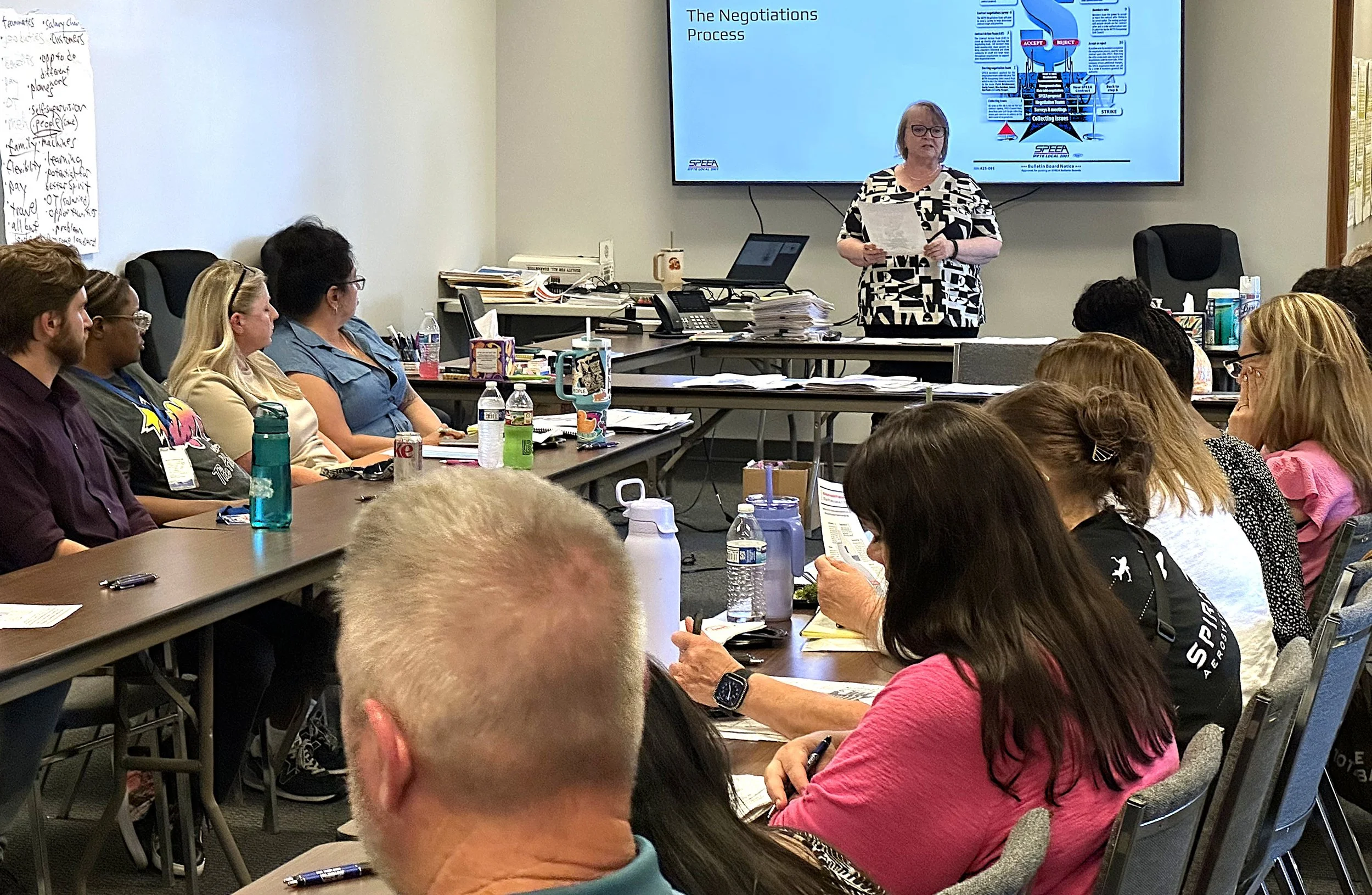 SPEEA Contract Administrator Susanne Murphy briefs the Wichita Technical & Professional Unit’s Contract Action Team on our union’s negotiation process.